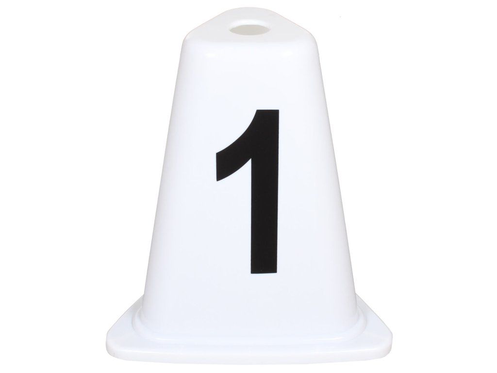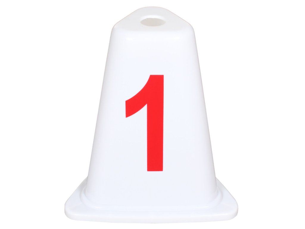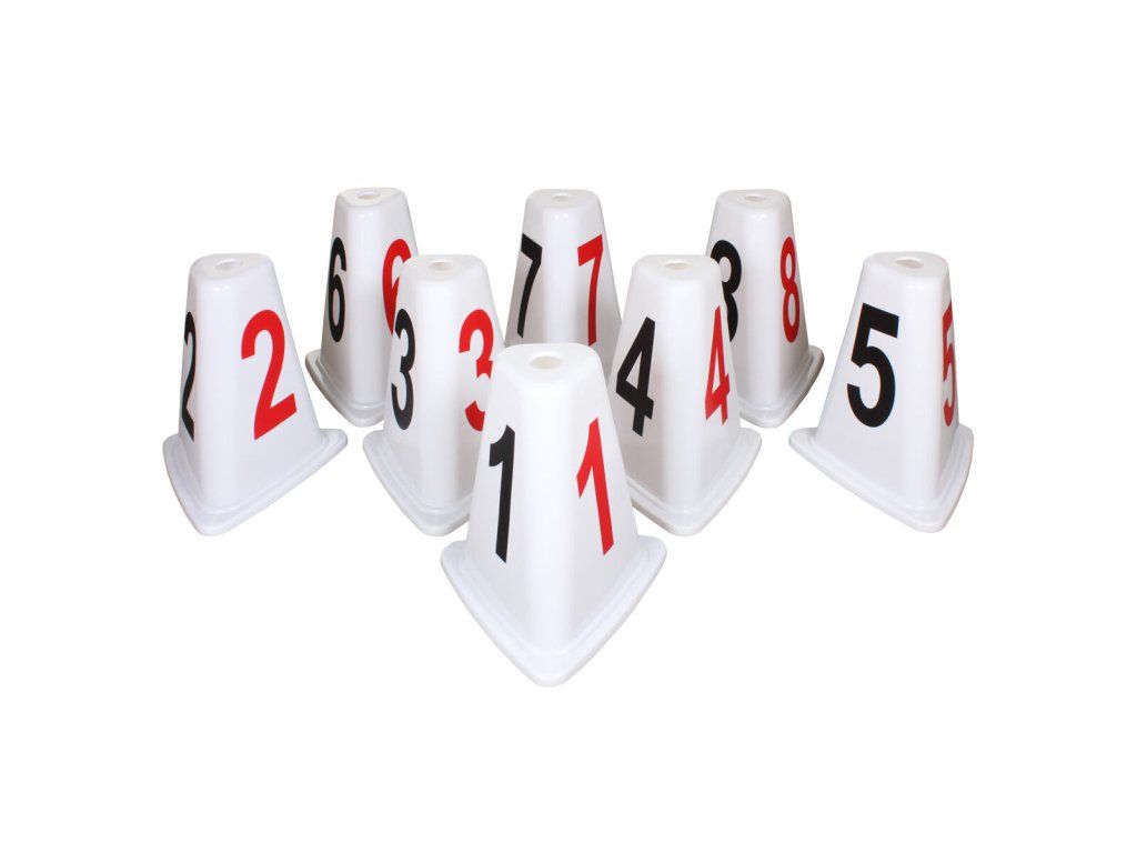 Sada osmi očíslovaných kuželů z kvalitního ABS plastu, určené k označení jednotlivých běžeckých drah na atletických oválech.