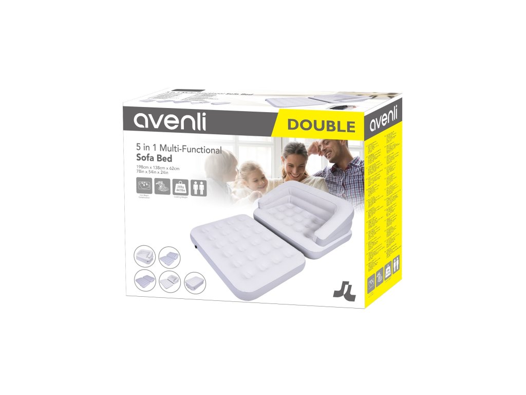 Nafukovací pohovka AVENLI Sofa Bed o rozměrech 198 × 138 × 62 cm nabízí až 5 různých variant použití. Může sloužit jako pohodlné křeslo, lenoška nebo se během chvilky promění na rozkládací matraci. Díky skládací konstrukci je ideální pro domácí relaxaci i příležitostné přespání hostů.