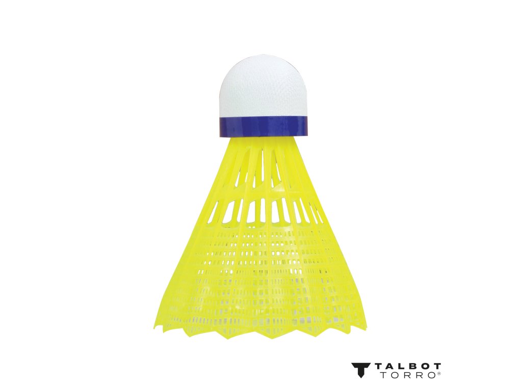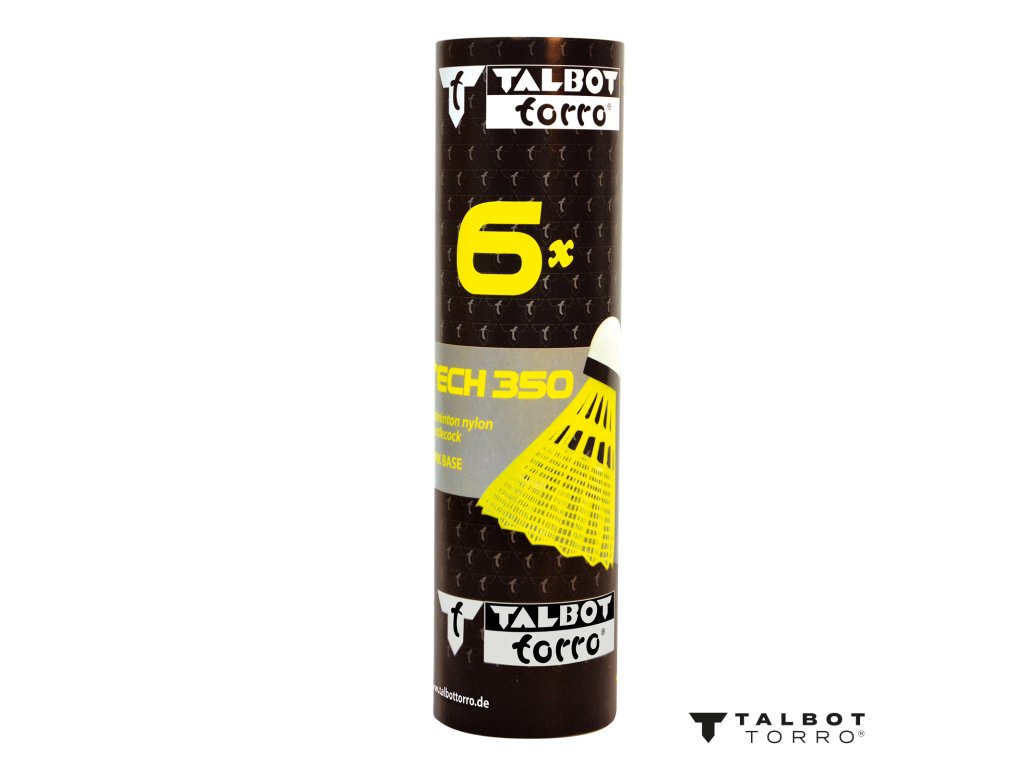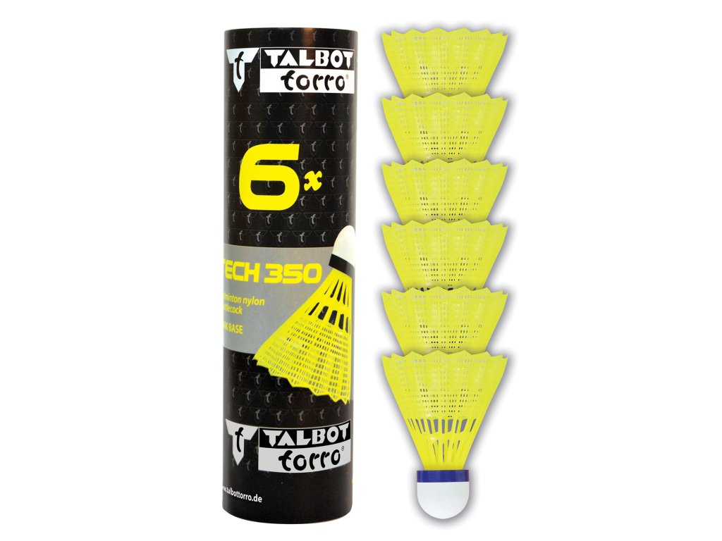Badmintonové míčky TALBOT TORRO Tech 350 od známé německo-britské značky TALBOT TORRO jsou odolné nylonové míčky se syntetickým korkem. Jsou vhodné zejména pro volnočasové sporty, tréninky či školy, ale také jako kvalitnější náhradní míček pro venkovní badmintonové hry. Míček má dobré letové vlastnosti. V dóze je 6 kusů středně rychlých žlutých míčků (modrý pruh). Rychlost lze rozpoznat podle příslušného barevného označení na hlavě míčku. Zde je připevněn barevný pásek.