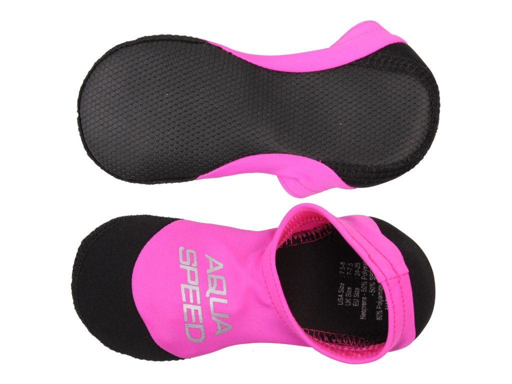 Dětské neoprenové ponožky Aqua-Speed Neo jsou více, než jen zajímavý doplněk pro děti na pláž nebo k bazénu. Ponožky jsou skladné, lehké, pohodlné, snadno se nazouvají, nebrání v přirozeném pohybu a hlavně poskytují ochranu před horkým pískem, chrání chodidla na kamenitých plážích a v případě bazénů minimalizují riziko uklouznutí. Ponožky jsou vyrobeny z měkkého a elastického materiálu v horní části a silnějšího neoprenu na podrážce s protiskluzovým povrchem. Material: Neopren (50% Polyester 50% Guma SBR); 80% Polyamid 20% Elastan