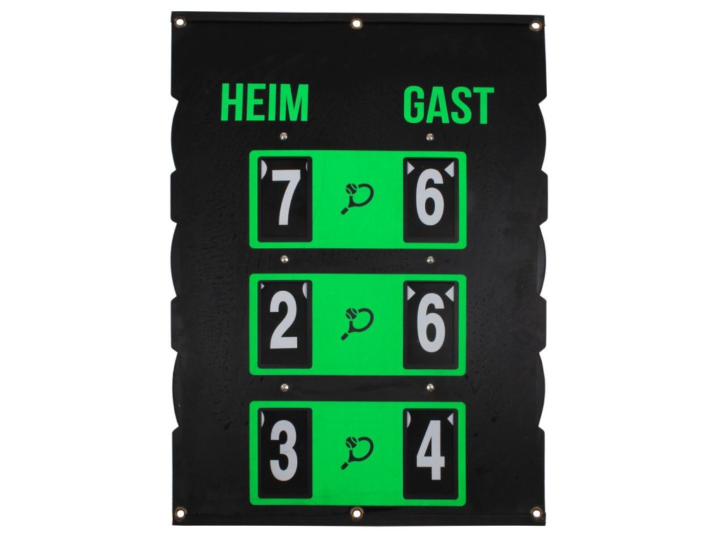 Oboustranný ukazatel skóre pro tenisové hráče a kluby. V německém jazyce, rozměr 83 x 58 cm.