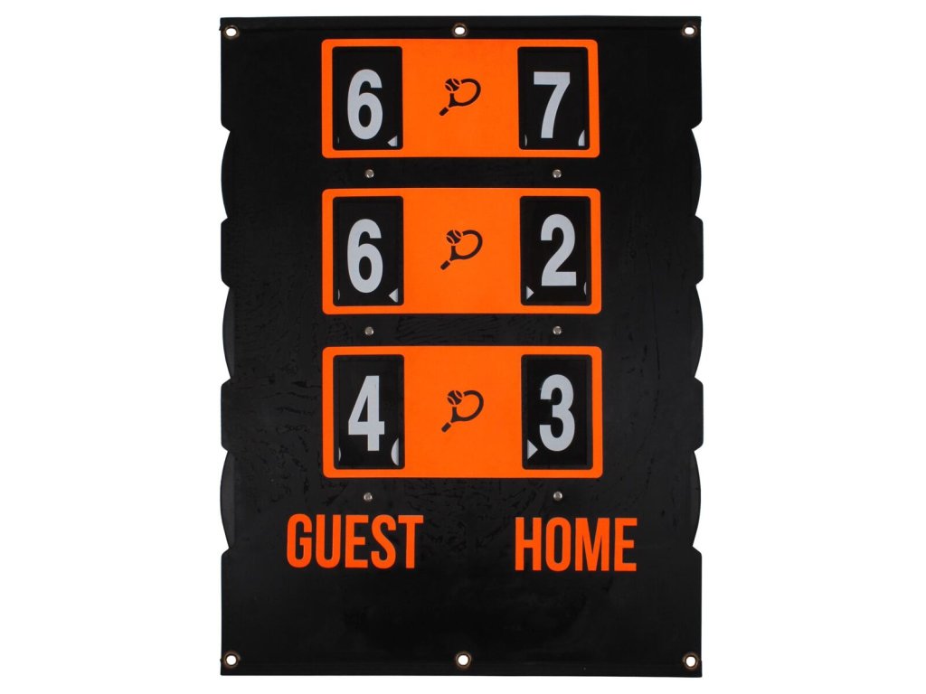 Díky oboustrannému ukazateli skóre Merco Scoreboard ENG budete spolehlivě zaznamenávat průběh každého tenisového duelu. Tří-setový ukazatel skóre s rozpětím bodů 0 – 7 má 9 cm velké bílé číslice na kontrastním černém podkladu a neonově oranžovém pozadí, aby bylo skóre dobře viditelné pro hráče i pro diváky. Pohyb číslic zajišťují manuálně posuvná kola po stranách ukazatele. Celkové rozměry ukazatele vyrobeného z odolného ABS plastu jsou 83 x 58 cm a na svém horním i dolním pogumovaném okraji je doplněný otvory pro zavěšení. Vzhledem k použitému materiálu má Scoreboard nízkou hmotnost 3,4 kg. Tento model je vyrobený s anglickými nápisy. - materiál: ABS plast, guma - rozměry: 83 x 58 cm - hmotnost: 3,4 kg - jednoduché používání - kovová oka pro zavěšení - anglické nápisy
