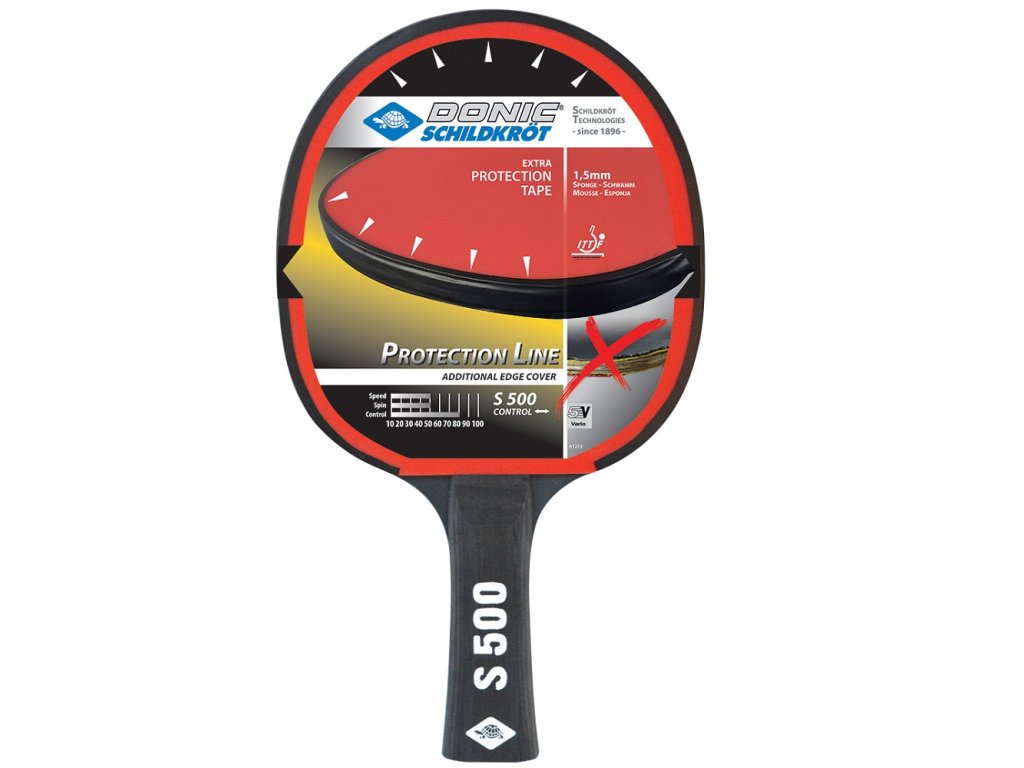 Střední model Donic-Schildkröt Protection Line je raketa S500. Je již vybavena trochu přilnavější gumou Schildkröt Elite schválenou ITTF (hladký povrch, pupínky na vnitřní straně) a 1,5 mm houbou, je to optimální výuková raketa pro první trénink s rotací a o něco rychlejší hrou. Povrch schválený ITTF umožňuje procvičovat hru s rotací/řezem. 1,5mm houba dává raketě přiměřené zrychlení pro rychlejší hru. Rukojeť má oblíbený konkávní tvar, a proto skvěle padne do ruky. Pálka nabídne porametry: speed 50 ze 100, spin 50 ze 100 a control 80 ze 100. Pálka Protection Line S500 je přímým nástupcem oblíbené pálky Team Germany 500, který je již léta oblíbenou školní raketou.