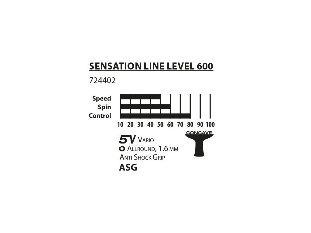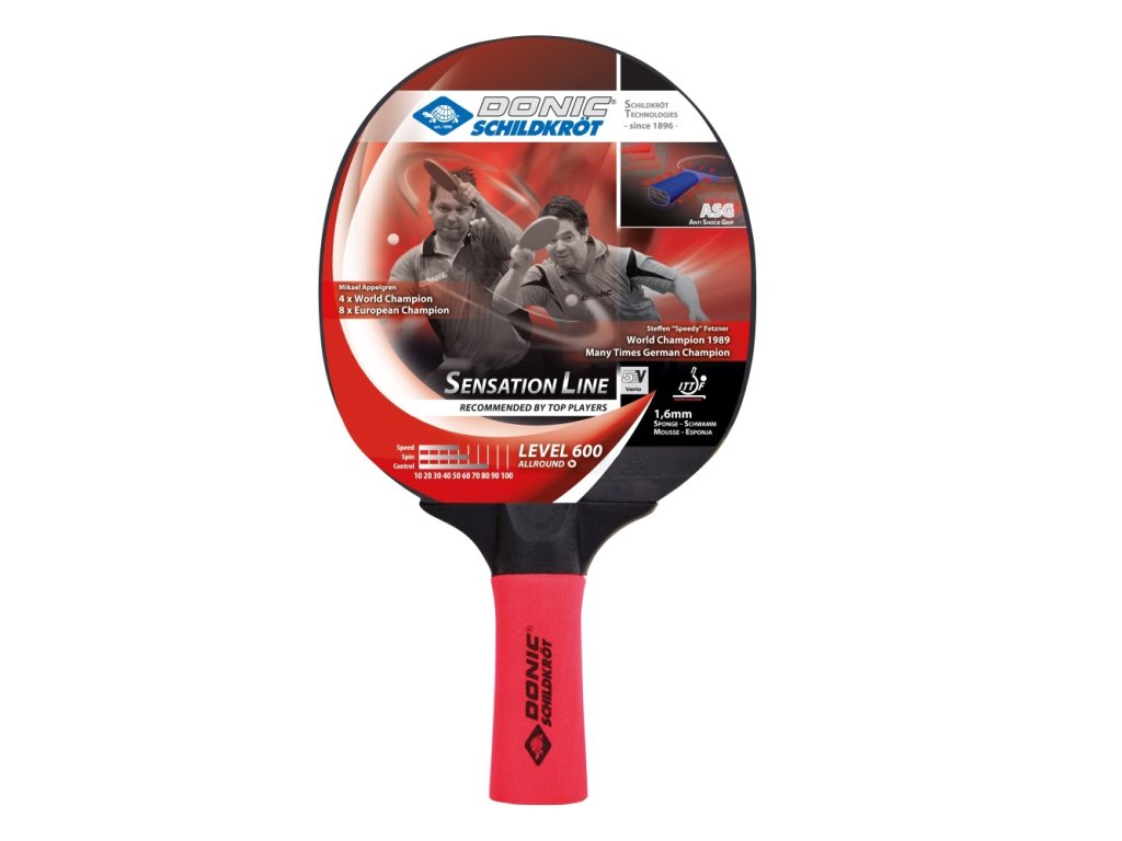 Pálka na stolní tenis DONIC Sensation 600 je pálka s velmi kvalitním zpracováním, která je vybavena protiskluzovou „Anti Shock Grip“ (ASG). Měkký a velmi odolný pěnový potah absorbuje pot a zajišťuje vynikající přilnavost a větší pohodlí. Rakety „Sensation Line“ jsou ideální pro ambiciózní hobby a volnočasové hráče, oblíbené jsou také ve školních klubech. Model Sensation 600 ASG je vybaven vysoce kvalitní gumou Schildkröt Prestige, která umožňuje dobře přenést různé herní techniky na míč. Houba o tloušťce 1,6 mm umístěná mezi povrchem a dřevem dosahuje velmi dobré kontroly míče