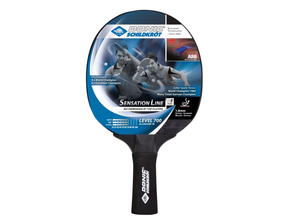 Pálka na stolní tenis DONIC Sensation 700 je pálka s velmi kvalitním zpracováním, která je vybavena protiskluzovou „Anti Shock Grip“ (ASG). Měkký a velmi odolný pěnový potah absorbuje pot a zajišťuje vynikající přilnavost a větší pohodlí. Rakety „Sensation Line“ jsou ideální pro ambiciózní hobby a volnočasové hráče, oblíbené jsou také ve školních klubech. Model Sensation 700 ASG boduje protiskluzovou gumou Schildkröt Avantgarde, která umožňuje snadné přenesení různých herních technik na míč. Houba o tloušťce 1,8 mm umístěná mezi pryží a dřevem generuje pořádnou dávku síly a vyšší rychlosti míče při stejné síle jsou výhodou oproti tenčí a tedy levnější houbě.