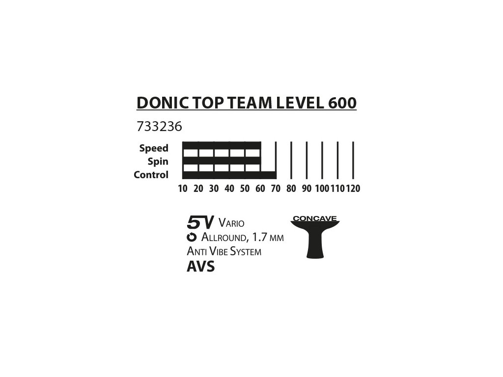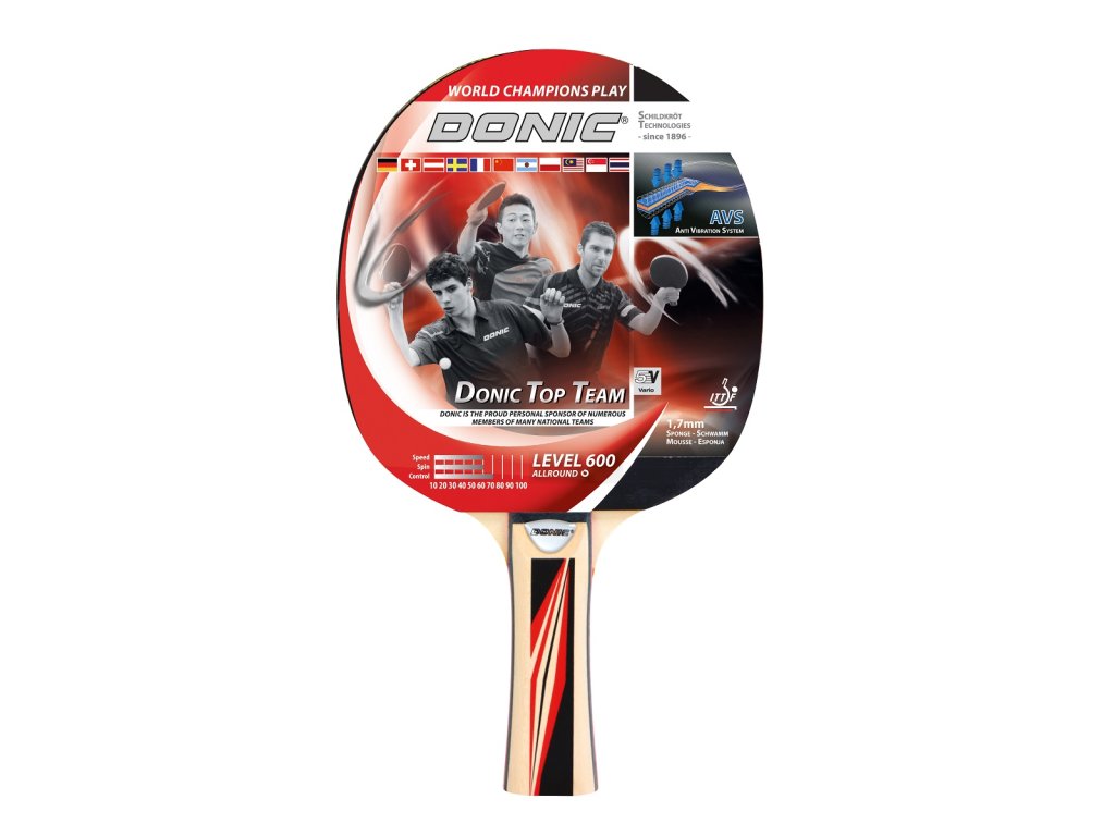 Pálka na stolní tenis DONIC Top Team 600 pro hráče vyžadující vyvážený poměr rychlosti a kontroly. Díky dvěma speciálním měkkým vrstvám, které jsou laminovány mezi čepelí a rukojeť pálka absorbuje otřesy. Výsledkem je, že AVS zvyšuje přesnost jak pro defenzivní, tak pro ofenzivní styl hry.