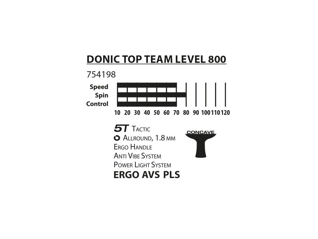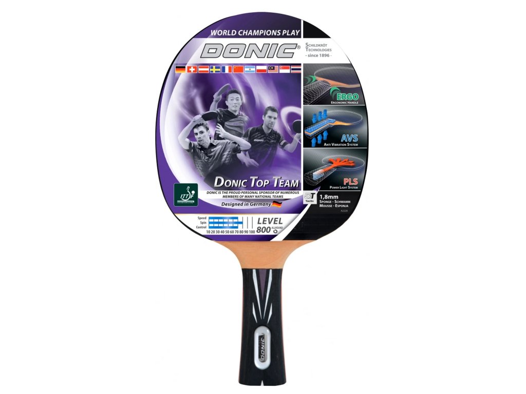Pálka na stolní tenis DONIC Top Team 800 je určena pokročilým hráčům vyznávajícím technickou hru. Díky dvěma speciálním měkkým vrstvám, které jsou laminovány mezi čepelí a rukojeť pálka absorbuje otřesy. Výsledkem je, že AVS zvyšuje přesnost jak pro defenzivní, tak pro ofenzivní styl hry. Zaoblený Ergo tvar rukojeti zabraňuje tlaku v ruce a poskytuje mimořádně pohodlný a příjemný pocit. Dutá rukojeť systému Power Light snižuje celkovou hmotnost pálky a přenáší těžiště směrem k hlavě, čímž nabízí mnohem vyšší výkon a rychlost při zachování vynikajícího pocitu.