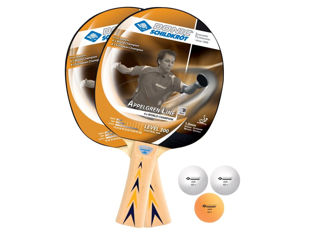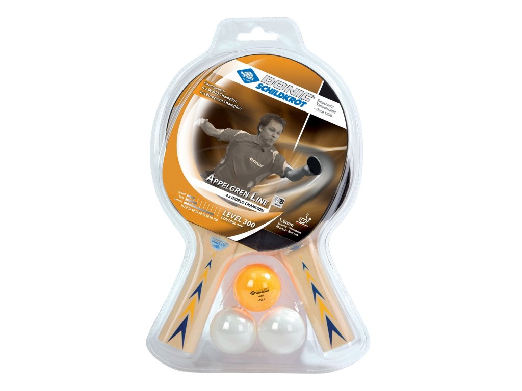 Set dvou pálek na stolní tenis DONIC Appelgren 300 a tří míčků.