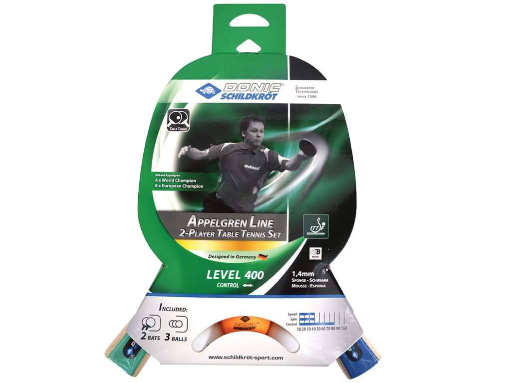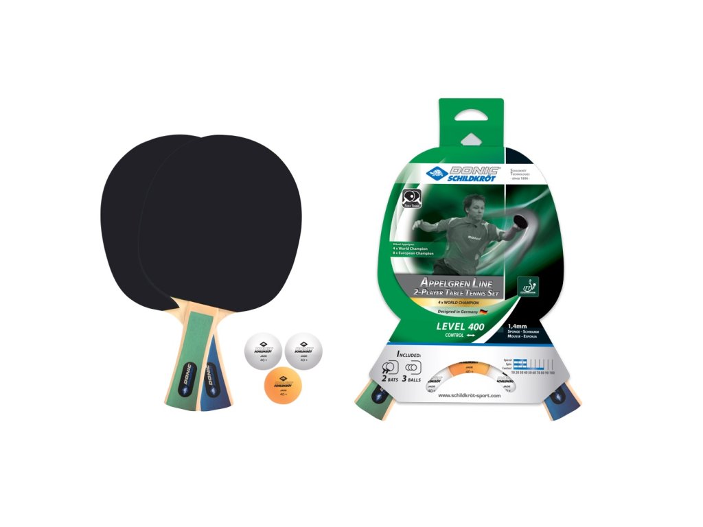 Set dvou pálek na stolní tenis DONIC Appelgren 400 a tří míčků.