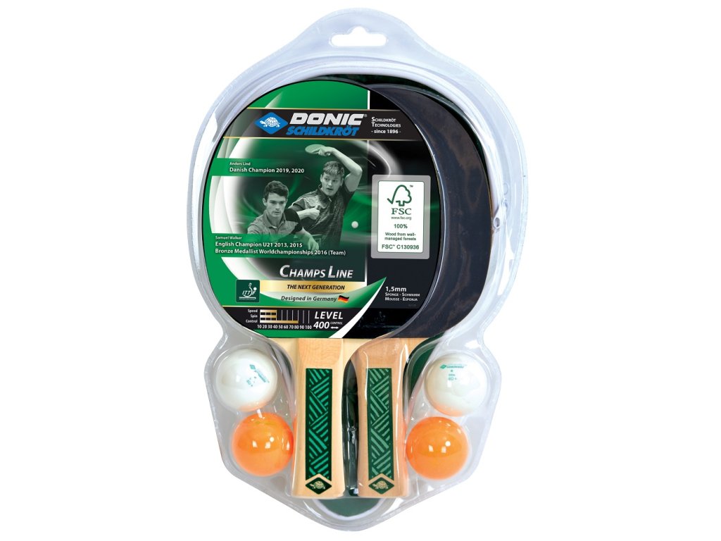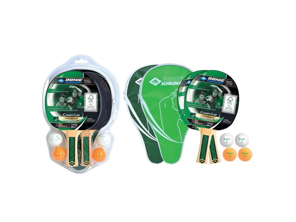 Set na stolní tenis DONIC Young Champs 400 FSC je vysoce kvalitní a velmi rozsáhle vybavený set na stolní tenis v rozumné volnočasové kvalitě i pro školní sporty. Součástí balení jsou 2 rakety úrovně 400 s nefritovou základnou schválenou ITTF s pupínky na vnitřní straně (hladká základna). Pod gumou je 1,5mm silná houba, která dává raketě jistou akceleraci, ale zároveň i dostatečnou kontrolu míče pro rekreační hru. U této rakety je důraz jasně kladen na kontrolu míče. Konkávní rukojeť sedí bezpečně v ruce. Sada obsahuje 2 samostatné obaly na rakety, takže lze dvě rakety přepravovat samostatně. V sadě jsou také 4 kusy kvalitních míčků na stolní tenis Donic-Schildkröt, 40 mm, v nové poly kvalitě (2 bílé, 2 oranžové) - bez celuloidu. Kompletní sada je zabalena v blistru, aby vše dorazilo nepoškozené. Řada Champs nyní také používá ekologicky šetrné, certifikované dřevo od organizace FSCTM (Forest Stewarship CouncilTM).