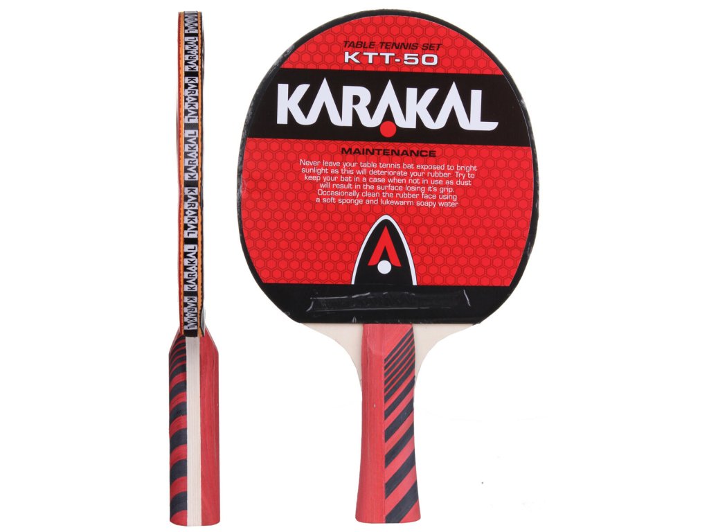 Set na stolní tenis Karakal KTT-50 se skládá ze dvou pálek a tří míčků. Pálky opatřené konkávní rukojetí jsou vyrobené z topolového dřeva, potaženého 1,8 mm silnou houbou a obranným pryžovým potahem. Obě pálky jsou společně s třemi míčky zabaleny v obdelníkovém obalu na zip. Hmotnost celého setu je 460 g.
