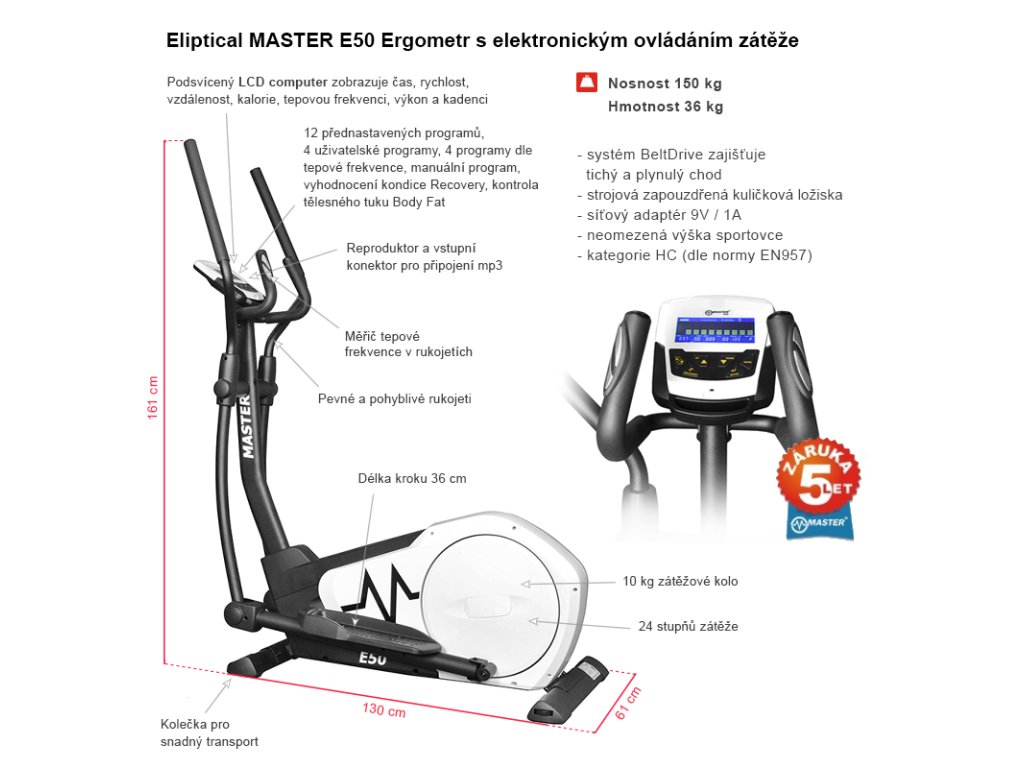 Eliptical MASTER E50 Ergometr s maximální výbavou pro náročné uživatele. Velký computer poskytuje kompletní přehled o Vašem tréninku a spoustu nadstandardních funkcí. Těžké zátěžové kolo ergometru zaručuje plynulý chod a možnost nastavení vyšší zátěže pro opravdové sportovce.