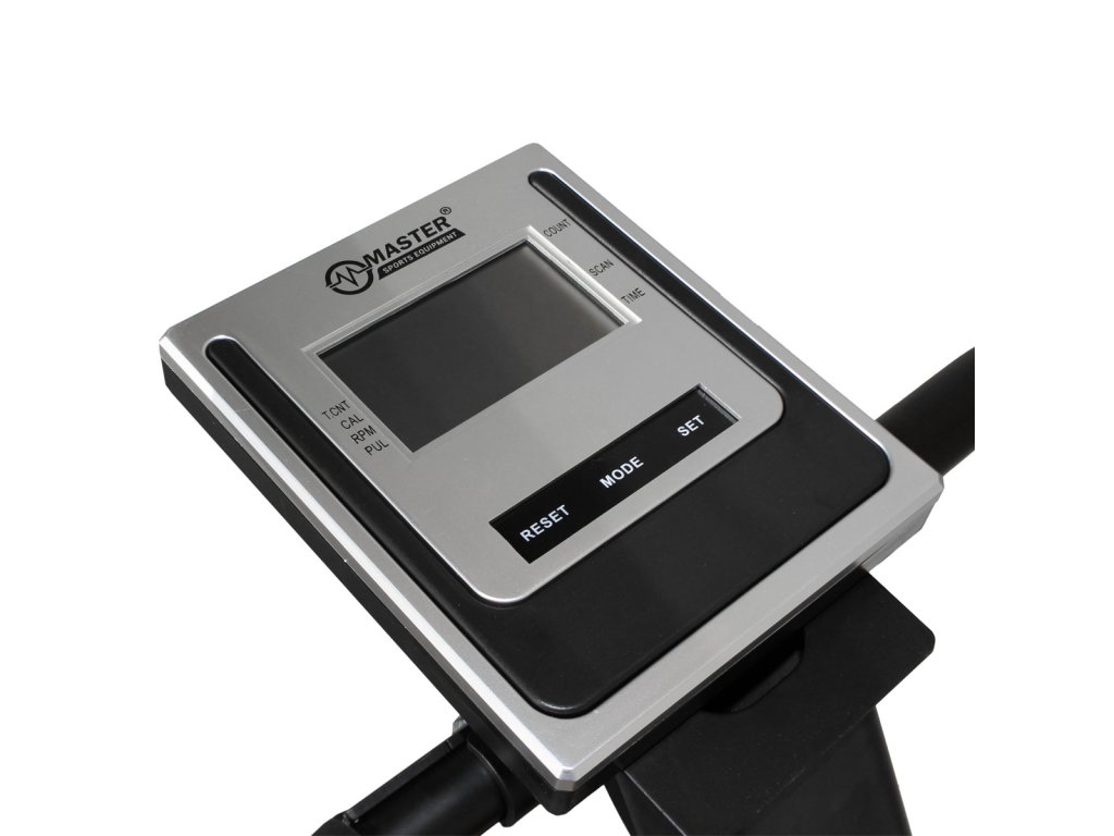 computer s LCD zobrazuje: čas cvičení, počet kroků, spotřebu kalorií, tepovou frekvenci, scan