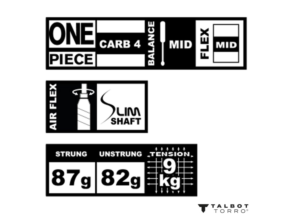 Nová raketa TALBOT TORRO Isoforce 511 je šikovná všestranná raketa pro ambiciózní rekreační sportovce se štíhlým rámem a shaftem (lehká a aerodynamická). Rám je vyroben z nejlepšího Carbon 4 (Hi-Modulus grafit, lehčí a tvrdší než klasický grafit) a má kvalitní jednodílnou konstrukci. Nízká hmotnost (82 g bez výpletu nebo 87 g včetně) a střední vyvážení z ní činí příjemnou raketu na hraní. Díky izometrickému tvaru hlavy je sweet sport (optimální bod úderu) mírně zvětšen, díky čemuž je raketa shovívavější k chybám v podobě neoptimálních zásahů. Střední flexibilita shaftu je dobrým kompromisem mezi kontrolou a výkonem. Díky Airflex grip cap (PU trubice mezi násadou a rukojetí) je shaft v rukojeti podepřen měkce a pružně => délka flexu a celková ohebnost shaftu se zvětšuje, síla se zvyšuje. Současně má PU účinek snižující vibrace. Raketa Isoforce 511 je vypletena multifilní strunou Talbot-Torro Galaxy o tloušťce 0,8 mm - odolná a elastická. Maximální doporučené napětí je 9 kg.