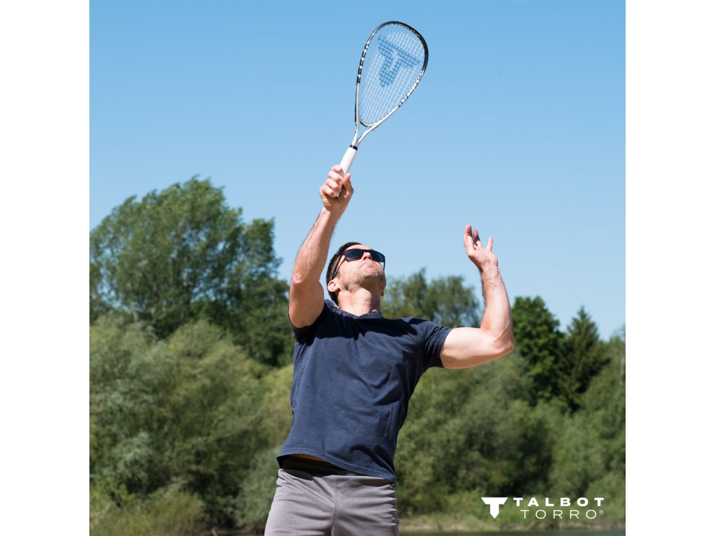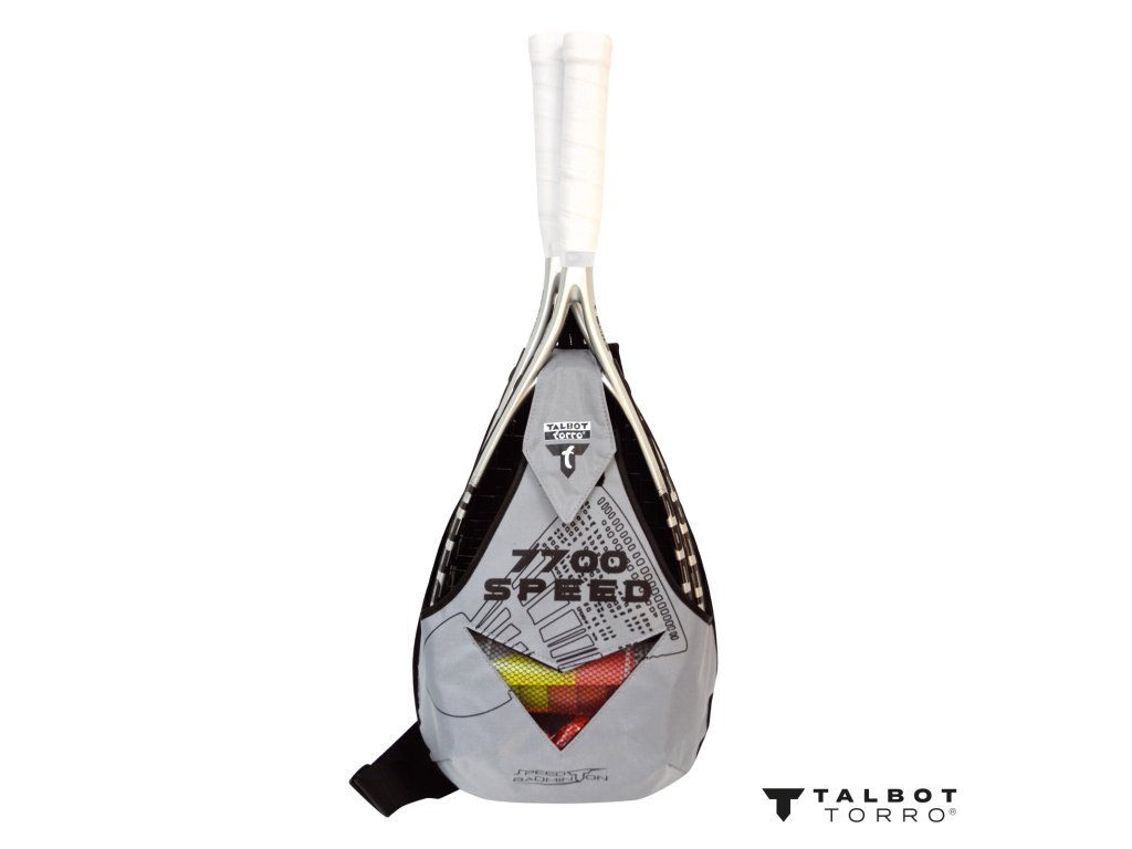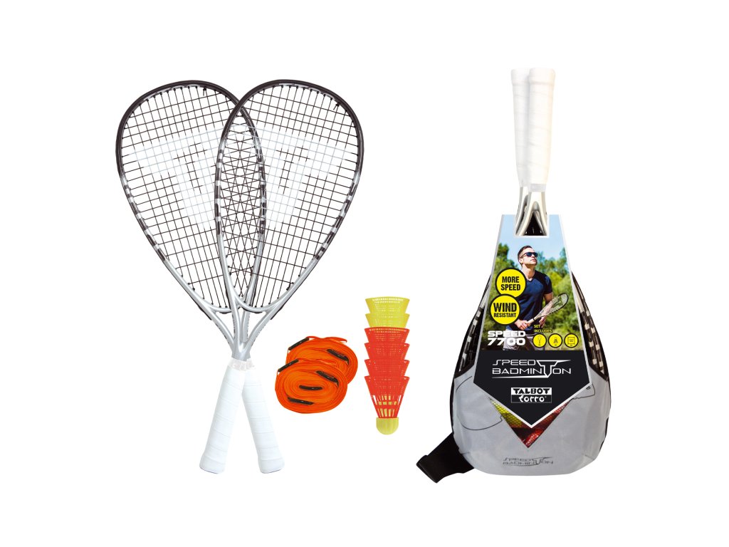 Prémiový speed badmintonový set pro náročné hráče : TALBOT TORRO Speed 7700. Set je určen pro dva hráče, v balení je 6 míčků (4 rychlé "závodní", 2 pomalejší "startéry"), dvě výkonné rakety (délka 58,5 cm, váha 175 g, profil rámu 19,0 mm), které jsou vyrobeny z vysoce kvalitního grafitového kompozitního materiálu a dodávají hráči sílu, kterou potřebuje pro rychlé rozehrávky - Mega Power Zone (větší otvory v hlavě rakety na vlevo a vpravo na 3. a 9. hodině) umožňují výpletu procházet rámem a také zvyšuje odrazovou rychlost míčku! Hlava rakety ve tvaru písmene U, ještě více zvyšuje úderovou plochu a tím i zrychlení. S touto špičkovou sadou lze dosáhnout rychlosti míče výrazně přes 200 km/h. Součástí sady je také kompletní hřiště Court Lines. Dva čtverce 5,5 x 5,5 m z popruhu s oky v rozích pro připevnění k zemi pomocí přiložených 8 kolíků. Oficiální vzdálenost mezi dvěma hracími poli je 12,8 m, ale může se mírně lišit v závislosti na úrovni hry. Vše je zabaleno v praktickém batohu s popruhem.