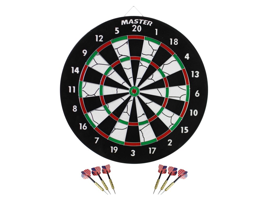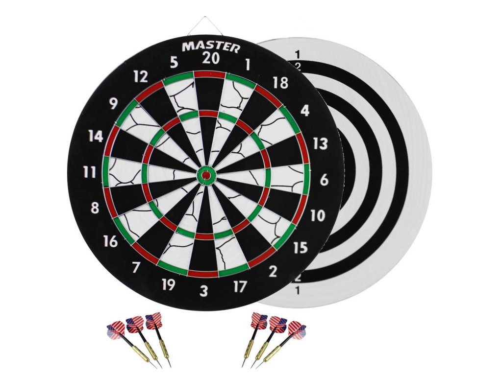 Oboustranný terč MASTER spolu se šesti šipkami. Šikovné řešení dvou typů terčů v jednom.