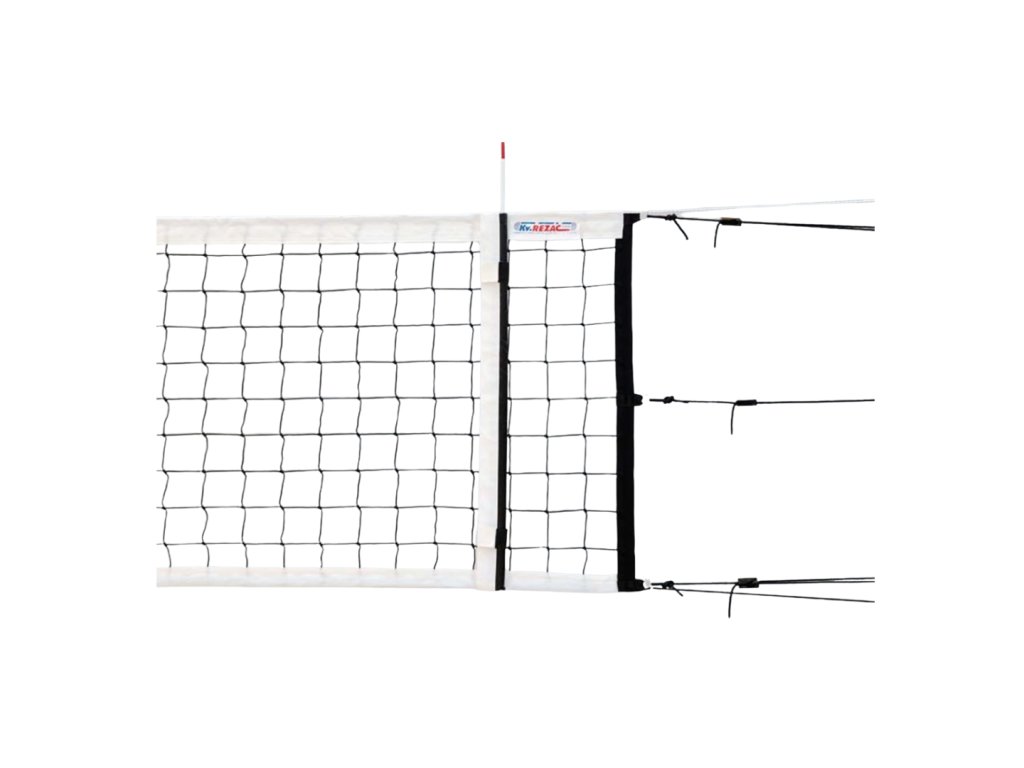 Volejbalová síť EXTRALIGOVÁ s rychloupínáky, PP 3mmVolejbalová síť pro vrcholové soutěže, vyrobená dle mezinárodních norem, otestovaná německou volejbalovou federací - označená známkou DVV 1.Uzlová černá síťovina z polypropylenu 3 mm, oko 10 cm. Horní okraj lemován PES bílým popruhem, hotová šíře lemování 7cm. Spodní okraj lemován PES bílým popruhem, hotová šíře lemování 5cm. Boky jsou lemovány POP černým popruhem v šíři 5cm a vyztuženy laminátovou tyčí.Horní okraj je protažen kevlarem o délce 12,5m s dvěma smyčkami a spodní okraj šňůrou 12,5m. Síť je na bocích opatřena 3 úvazky s plastovými rychloupínáky pro lepší a rychlejší vypnutí sítě.Součástí sítě jsou vytyčovací pásky šíře 5cm. (Pouzdra a anténky nejsou součástí sítě)Tento produkt nelze zaslat dopravcem Zásilkovna!!!
