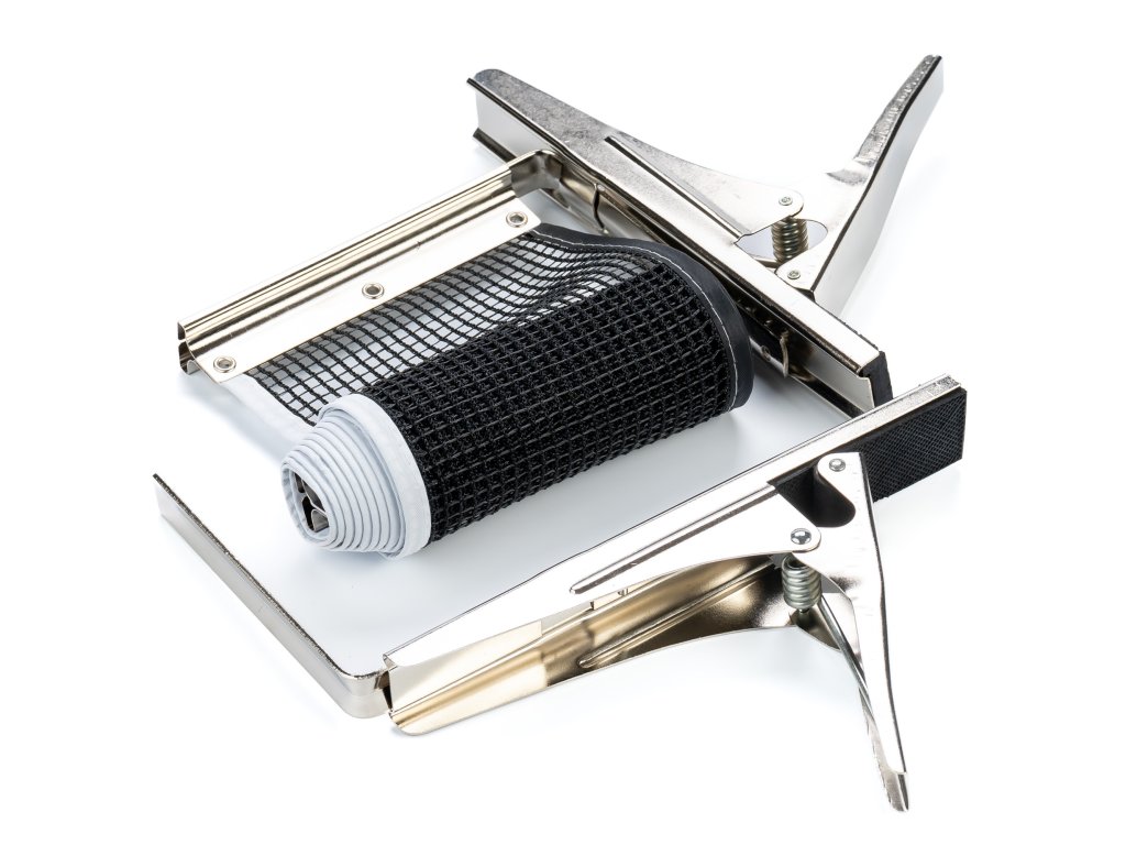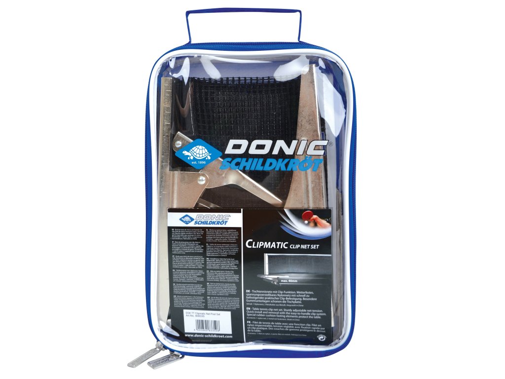 Síťka na stolní tenis DONIC Clipmatic je oblíbená síť renomovaného výrobce. Jednoduchá kovová konstrukce s praktickým uchycením pomocí klipu nevyžaduje žádnou složitou montáž k desce stolu. Síťka je určená pro stoly s tloušťkou desky do 40 mm. Nylonová síť s regulací napnutí je součástí balení. Vše je zabaleno v praktickém sáčku na zip a rukojetí pro přenášení