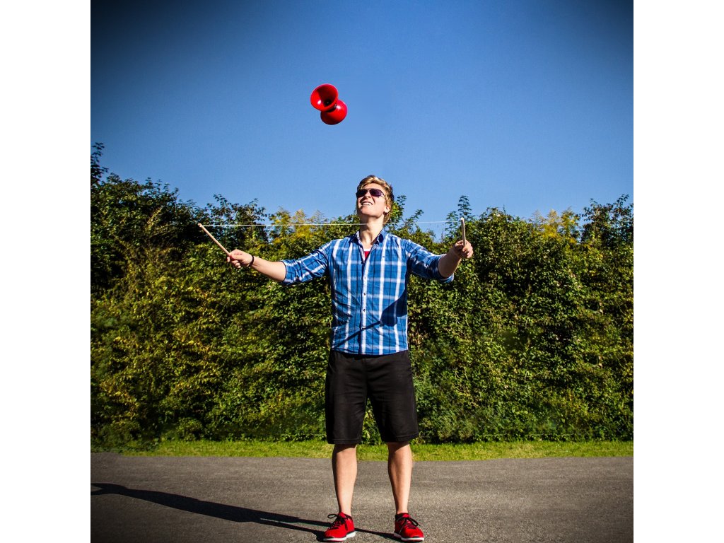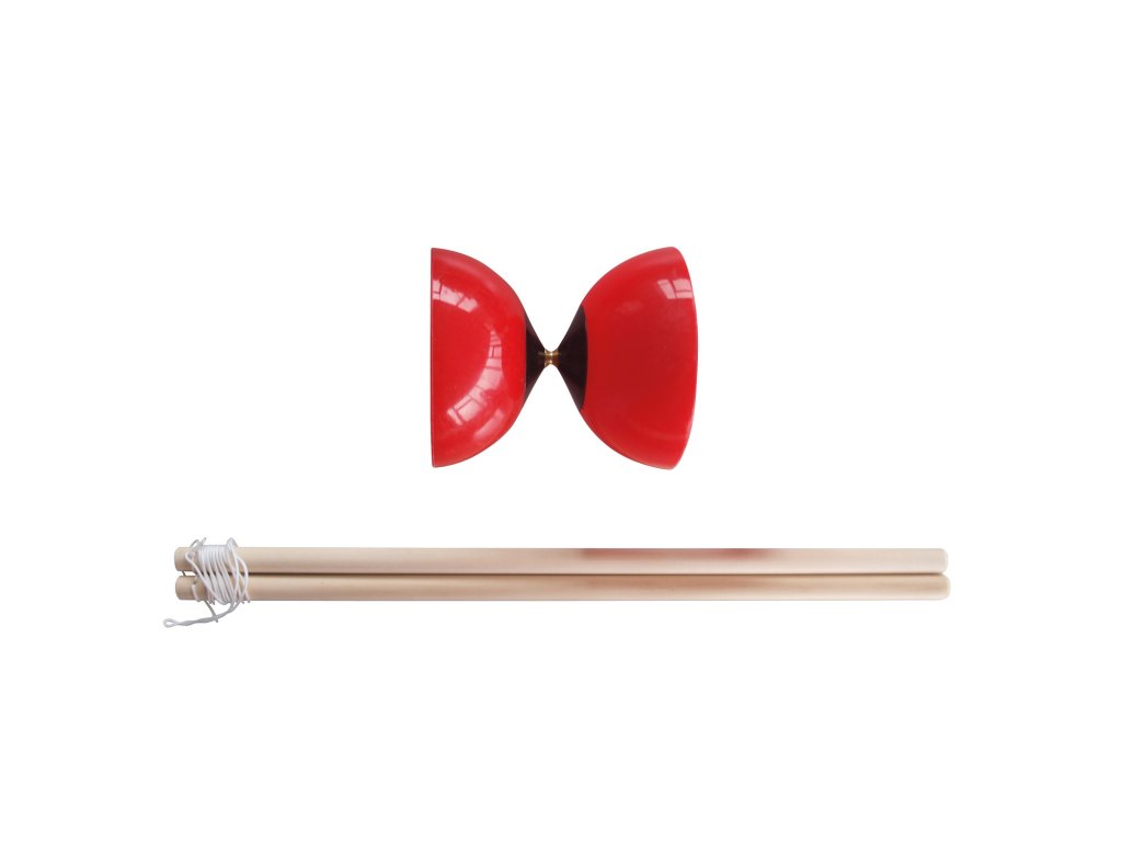 Diabolo je vyrobeno z elastického červeného plastu, průměr 10 cm, šířka 11 cm, hmotnost 110 g