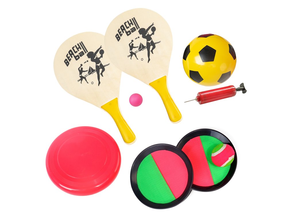 Oblíbený herní set MASTER 4 hry poskytne rozmanitou letní zábavu celé rodině. Set obsahuje celkem čtyři hry - set pro plážový tenis Beach Ball, Frisbee létající talíř v růžové barvě, nafukovací fotbalový míč 6" s pumpou a sadu pro Catch ball pro dva hráče.