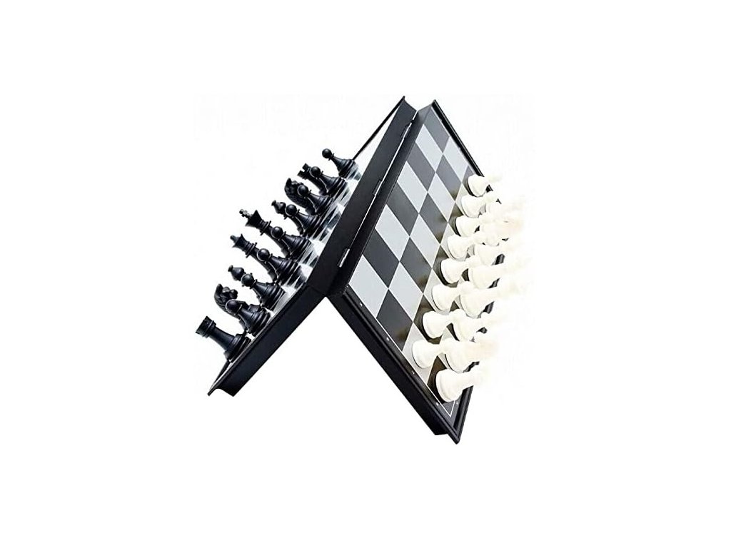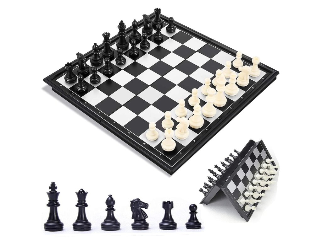 v balení: skládací magnetická šachovnice, sada šachových figurek, sada kamenů na hru dáma